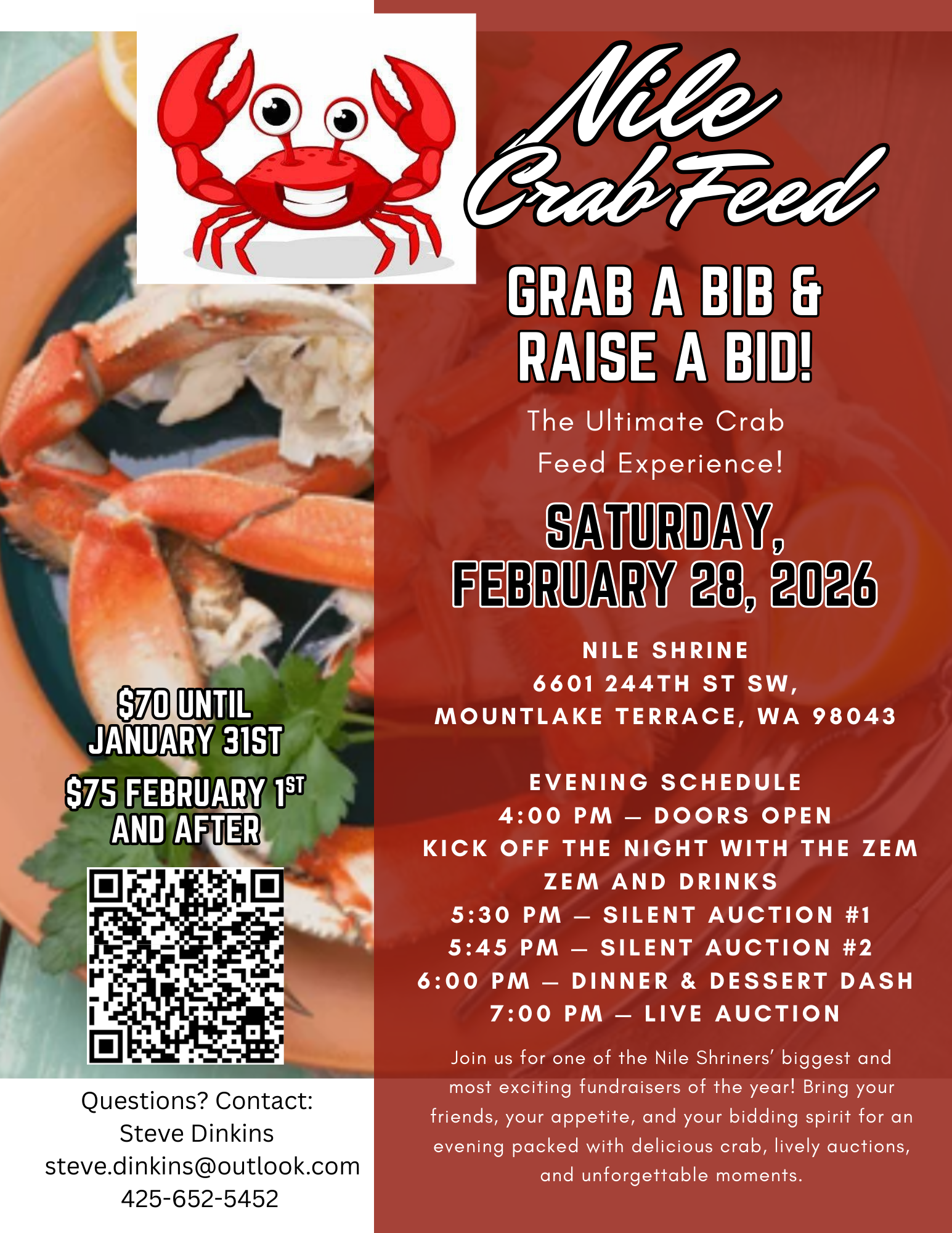 Join us for one of the Nile Shriners’ biggest and most exciting fundraisers of the year! Bring your friends, your appetite, and your bidding spirit for an evening packed with delicious crab, lively auctions, and unforgettable moments.